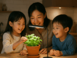 バジルやミントなどのハーブは、キッチンでよく使う植物の代表例です。育成用LEDライトを吊るすことで、日当たりを気にせず育てることができ、使いたいときに新鮮な葉を摘んで料理に活用できます。ライトの光が植物を照らす姿は、インテリアとしてもスタイリッシュで、キッチン全体をおしゃれに演出してくれます。