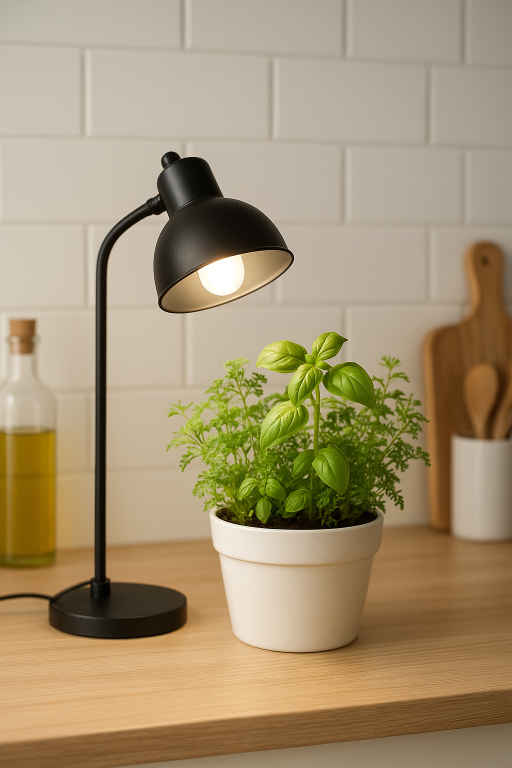 キッチンミニガーデンでは、光が植物全体に行き渡るように配置を工夫することがポイントです。光が真上から当たるだけでなく、やや斜めから照射することで、葉の陰まで光が届きやすくなります。スタンドの高さを調整できるタイプであれば、植物の成長に合わせて光の距離を変えることもできます。