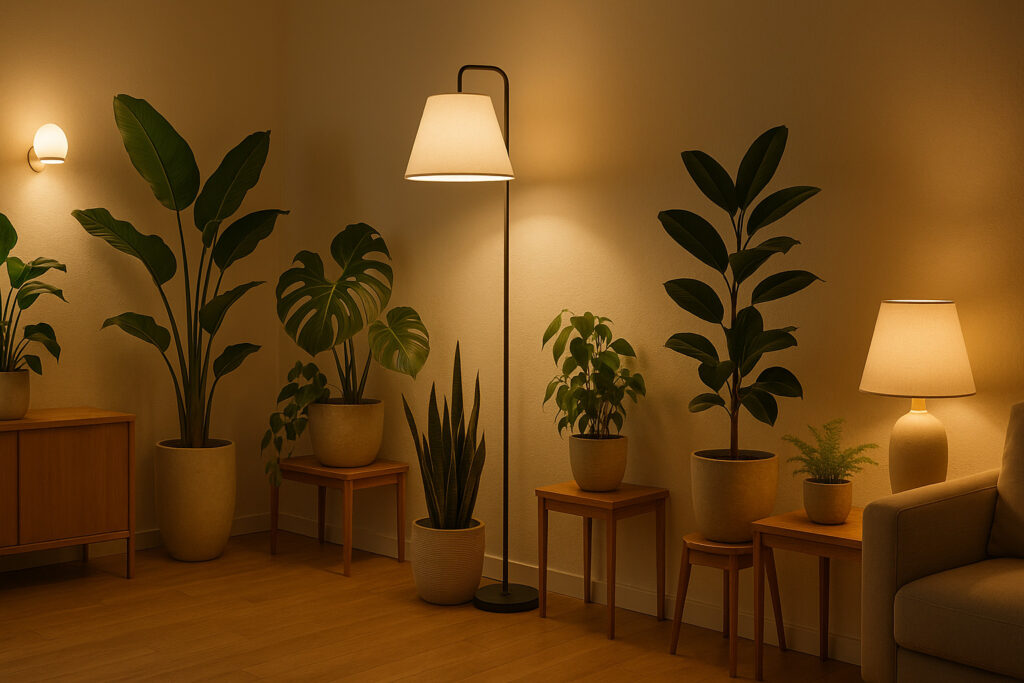 次に、照明の温かさも考慮しましょう。暖色系のライトは、植物の緑とのコントラストが鮮やかで、部屋全体を温かみのある空間に変えてくれます。特にリビングルームや寝室では、心地よさを引き立ててくれる暖色系の照明がおすすめです。