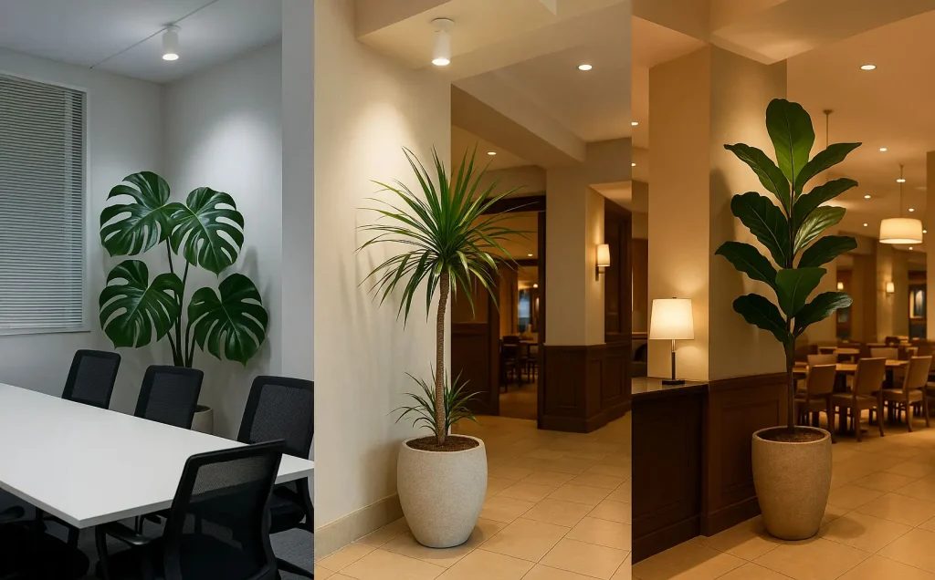 照明と植物を組み合わせることで、温かみのある雰囲気を演出できます。特に高演色LEDを使用すれば、商品の色や料理の見た目を自然に引き立てます。 - オフィスに