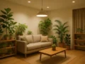 まず鉄則となるのが、「グリーン×間接照明」の黄金バランス。特にモンステラやパキラなどの大型観葉植物を窓際に配置し、その葉の影が壁に映るよう設計することで、自然の温もりを空間全体に広げることができます。さらに床置き型のLED間接照明を植物の根元に設置すれば、葉の美しいシルエットが浮かび上がり、静かな森の中にいるかのような安らぎを演出できるのです。