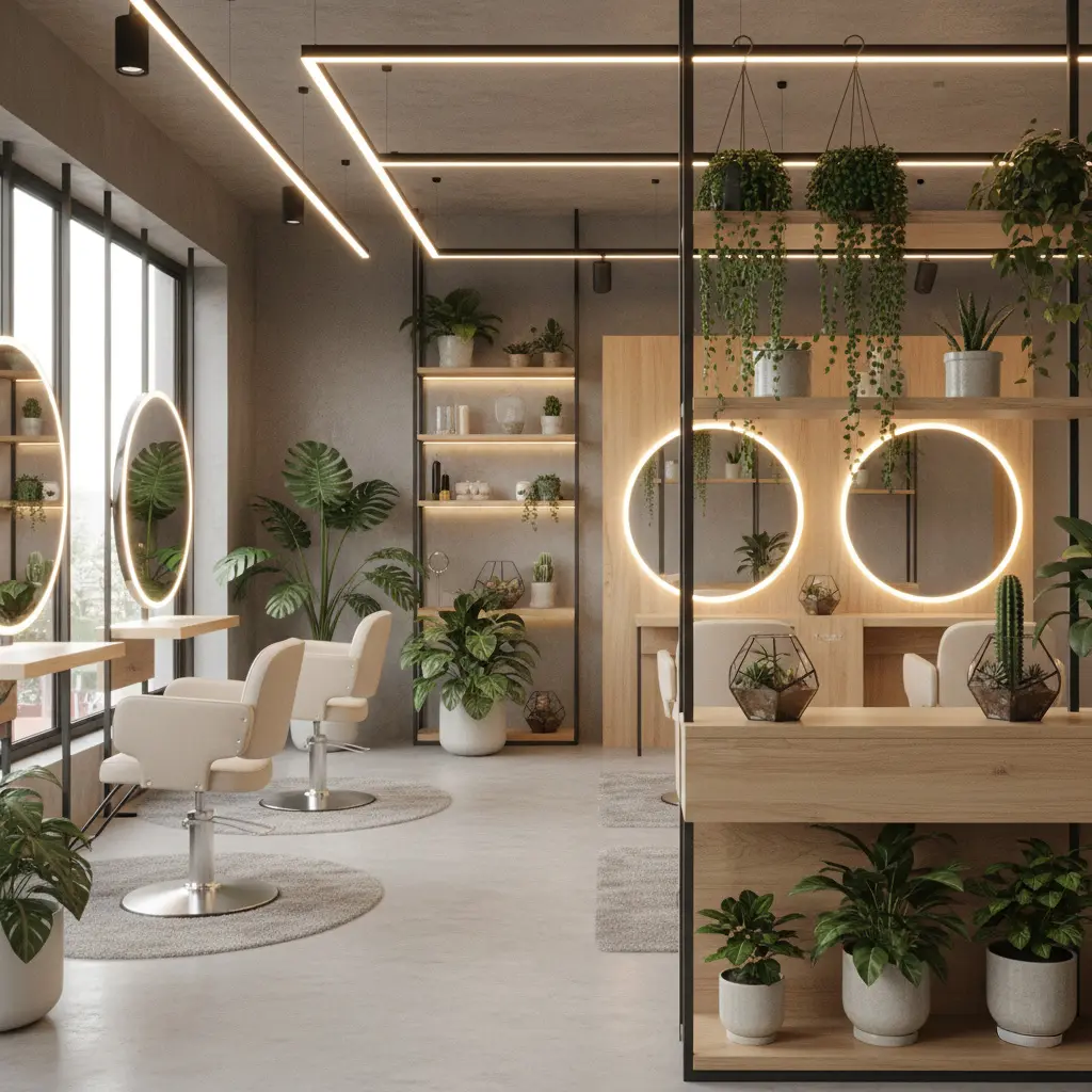 配置による空間デザイン: 植物をただ並べるのではなく、照明の光の範囲を意識して配置します。例えば、壁際に配置することで、壁に映る植物の影もアートとして楽しむことができ、より奥行きと癒しを感じられる空間になります。美容室であれば、セット面やレセプション周りに配置することで、お客様に心地よさを提供し、ブランディングにも寄与します。