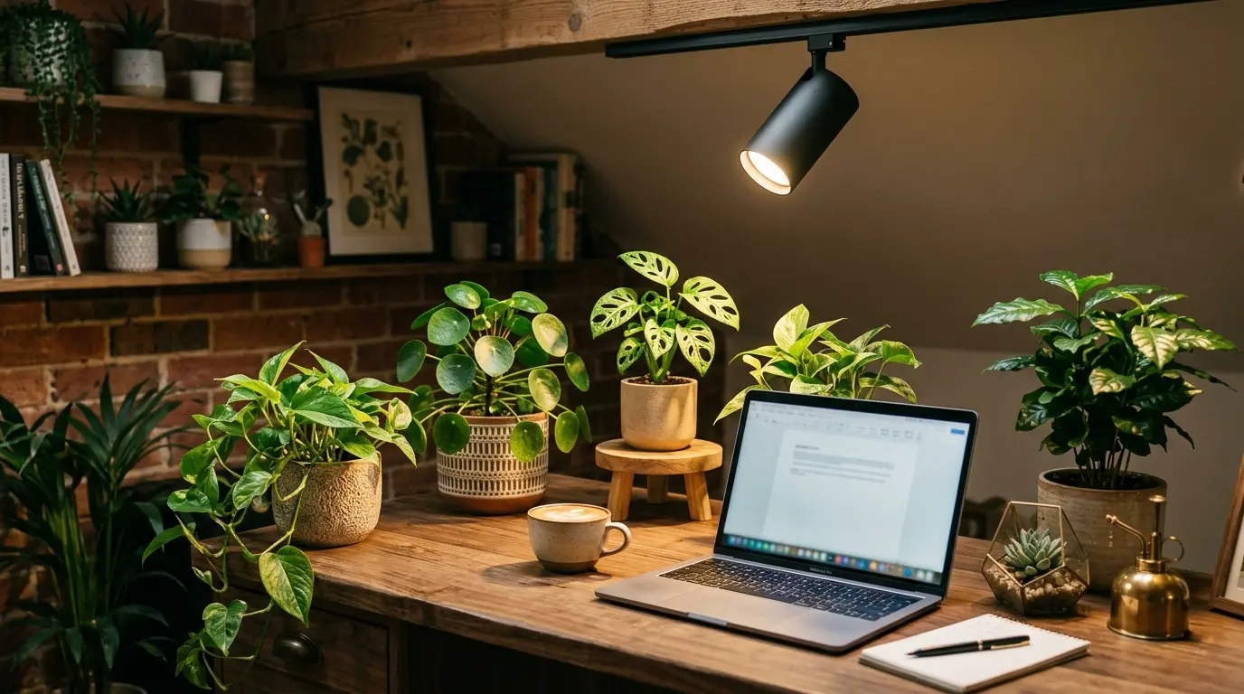 初めて観葉植物をデスクに迎える方にとって、室内の日照不足は最も大きな悩みになりがちです。しかし、植物育成用白色LEDスポットライトを活用すれば、太陽の光が届きにくい部屋の奥や窓のないワークスペースでも、植物を青々と健康に育てることができます。ここでは、インテリア性と実用性を両立させながら、デスク周りをカフェのようなおしゃれな空間に変える具体的な活用法をご紹介します。