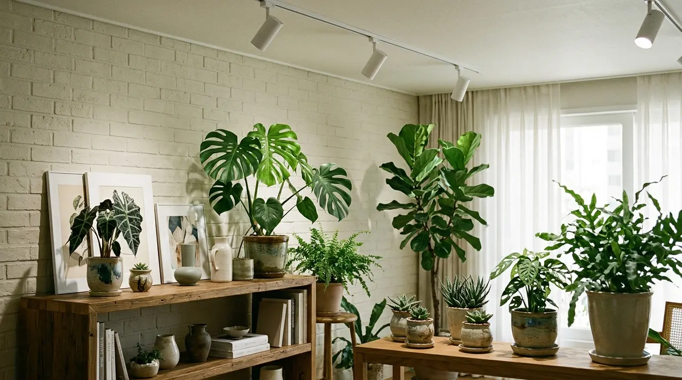 また、照明の配置方法にも工夫を凝らすことで、より洗練された印象を与えられます。天井にライティングレール(ダクトレール)を設置し、そこから植物育成用LEDスポットライトを取り付けるスタイルは、空間をすっきりと見せる人気のテクニックです。複数の植物を並べて上からスポット的に照らすことで、まるで本格的なボタニカルカフェのようなディスプレイを楽しむことができます。棚の上やデスク周りの小さな観葉植物には、クリップ式のライトやスタイリッシュなスタンドライトを活用してピンポイントで光を当てるのも非常に効果的です。
