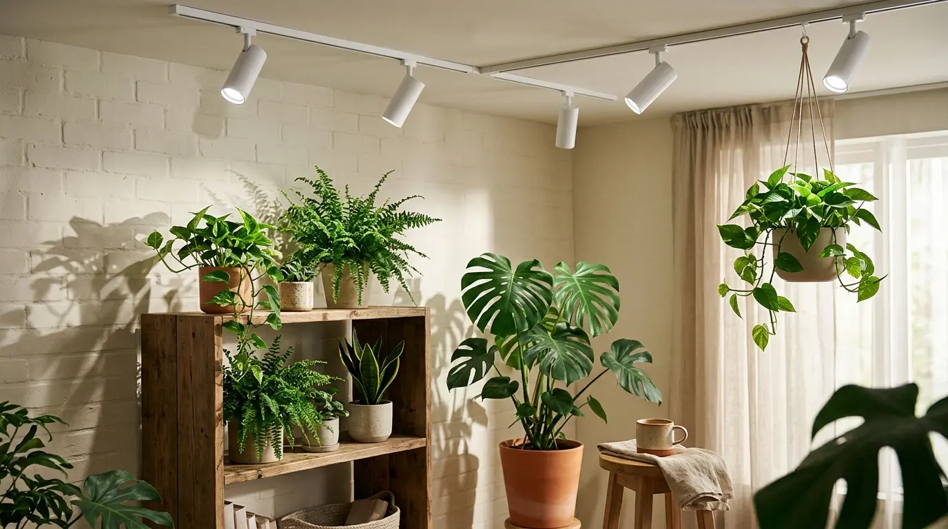 さらに、壁掛けで楽しむビカクシダ(コウモリラン)や、天井からハンギングするポトスといった立体的な配置の植物に対してスポットライトを当てると、お部屋全体に緑の躍動感が広がります。植物の瑞々しいグリーンと、白色LEDのクリアで優しい光の相乗効果により、日当たりの悪いお部屋でも生き生きとした美しい植物の姿を堪能できます。