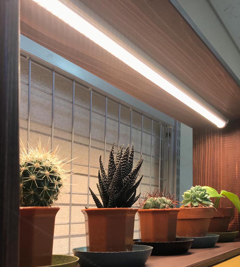 加えて、白色LEDの光は、植物の形態形成にも良い影響を及ぼすことがわかっています。適切な光環境下では、葉の間隔が短くなり(節間が詰まり)、見た目にも充実した、美しい樹形に成長する傾向があります。実験では、一般的な観葉植物で、より濃い緑色の葉と、丈夫な茎が観察されています。